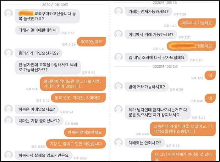 교복수집한다는 남자.. 처음에는 택배거라한다고 하더니 갑자기 직접거래하고 싶다고.. 혼자 나올수있나요 ㄷㄷ