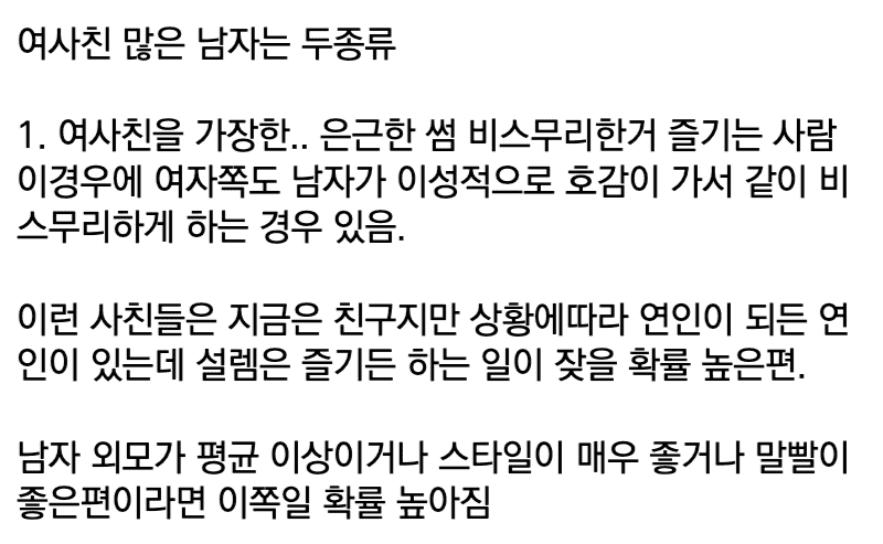 여사친이 많은 남자 어때? 보자마자 열받는 사람도 있고 이해 할 수 있다는 사람도 가끔(?) 있을거야. 아마 이런 친구는 자기도 남사친이 많을 확률이 높아.