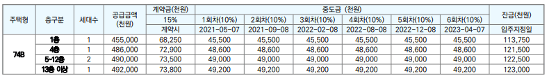 공급 세대수는 1층, 4층, 8층, 9층, 14층입니다. 층구분에 따른 중산 자이 분양가가 다릅니다. 계약금은 15% 납부해야합니다.
