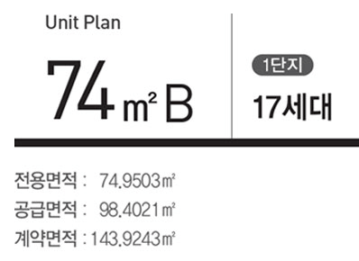 중산 자이 무순위 청약 입주자 공고입니다. 총 공급세대는 5세대가 무순위로 나왔습니다. 주거 전용면적은 74B입니다. 아래에서 평면도 살펴보시죠.