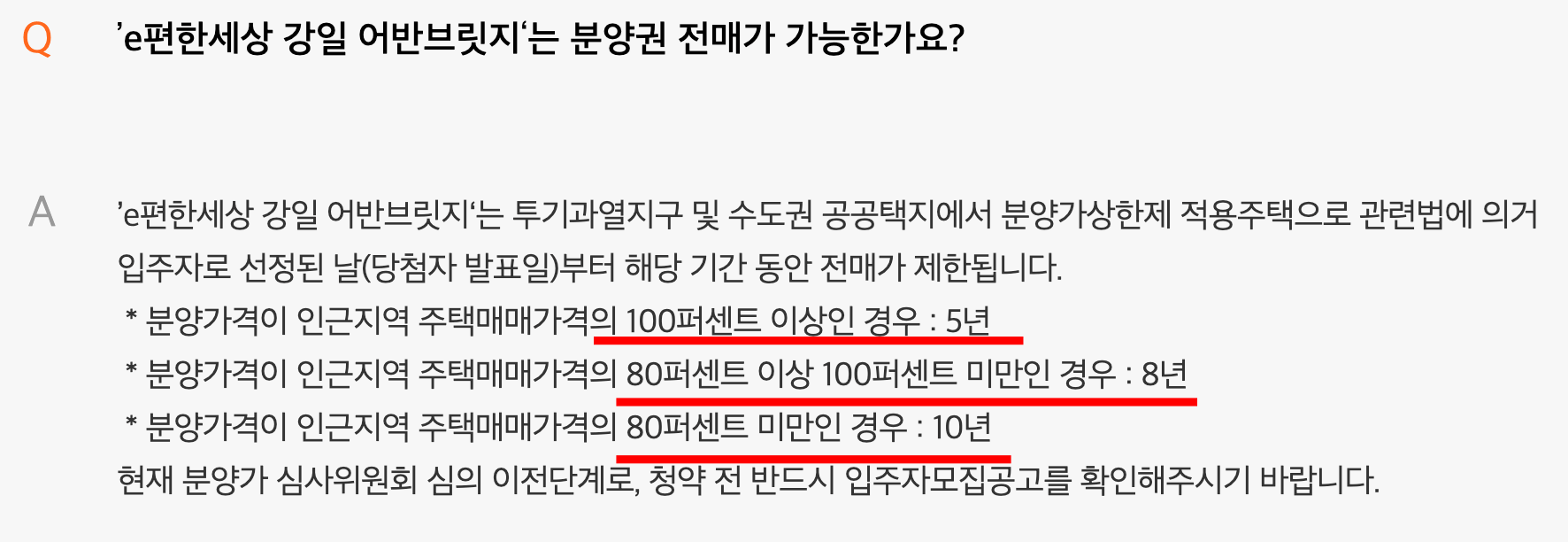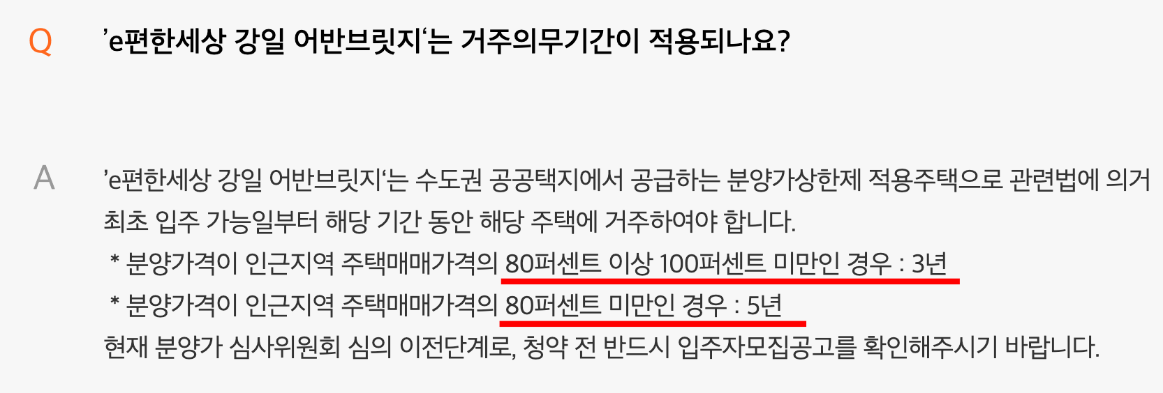 고덕 강일 어반브릿지 거주의무기간의 경우 인근지역 주택매매가격의 80% ~ 100%미만인 경우에 3년, 80%미만인 경우 5년입니다.