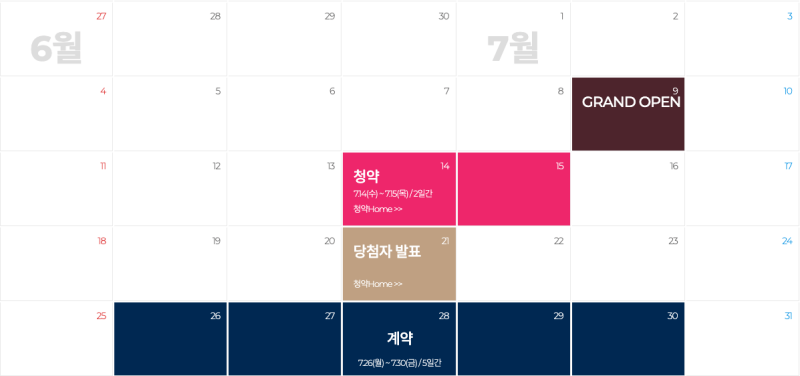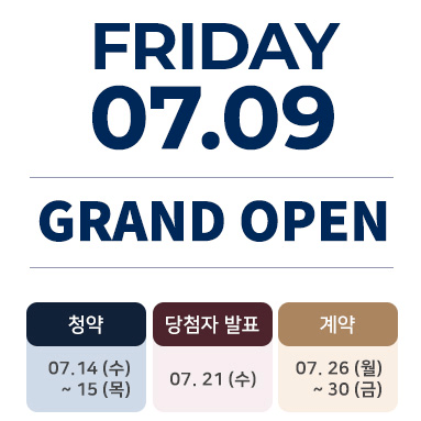 청약 신청은 청약홈에서 진행하며 다가오는 7월 14일(수) ~ 15일(목) 2일간 진행이 됩니다. 당첨자 발표는 한 주 뒤 7월 21일(수) 16:00 이후 입니다. 계약일시는 7월 26일(월) ~ 30(금) 5일동안 입니다.
