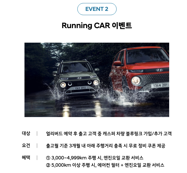 또한 현대차에서 캐스퍼 케어스(CASPER CARES)를 운영합니다. 이는 신차 특화 할부와 캐스퍼 전용카드, 중고차 잔가 보장 서비스, 차량 사고 케어 등 혜택을 제공 할 예정이라고 합니다.