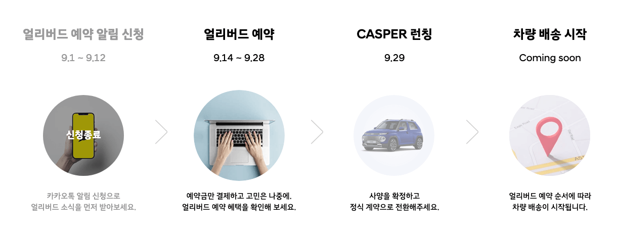 캐스퍼를 가장 빨리 만날 수 있는 기회! CASPER 얼리버드 예약 혜택 및 일정, 가격과 사양정보를 확인하세요. 현대자동차 캐스퍼 사전예약