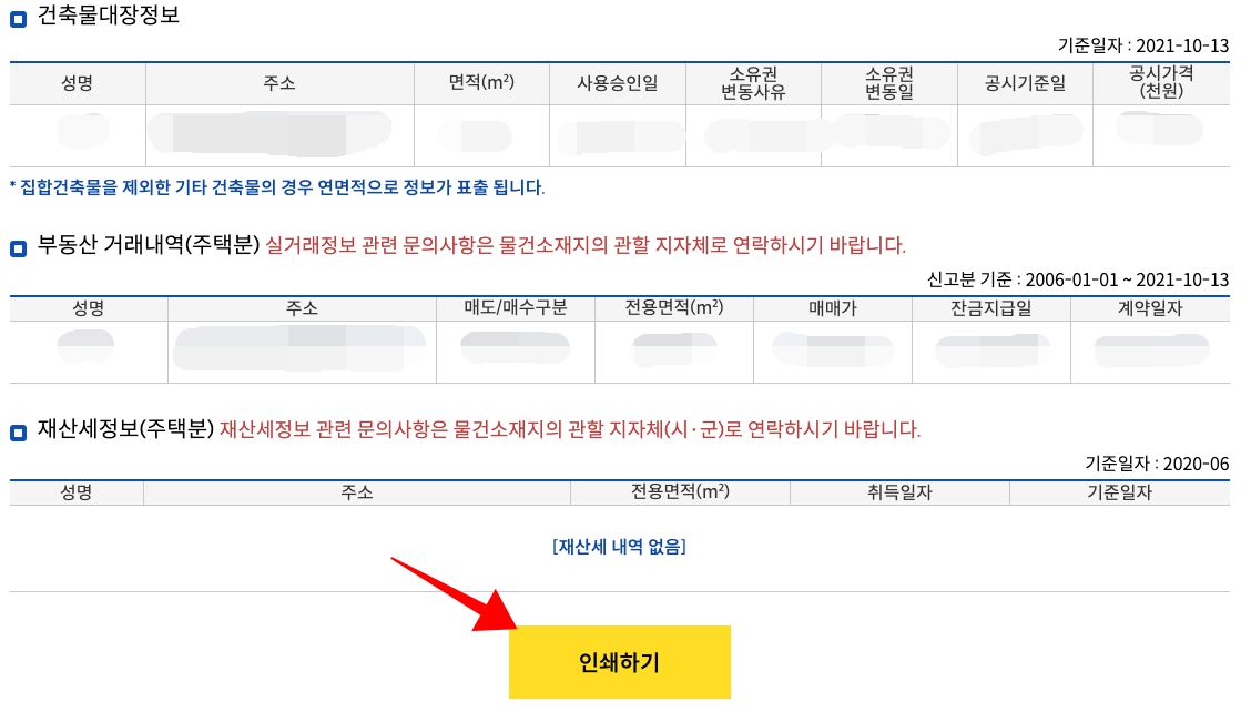 조회결과 화면입니다. 주택을 소유하고 있다면 건축물대장정보, 부동산 거래내역등을 확인 할 수 있습니다. 필요하다면 인쇄하셔서 사용하시면 되겠습니다.