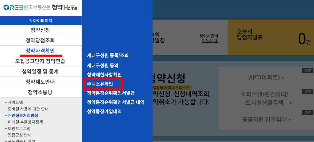 청약홈 홈페이지 화면입니다. 왼쪽 메뉴를 확인 후 주택소유확인에서 무주택 기간 확인 서류를 발급 받을 수 있습니다.