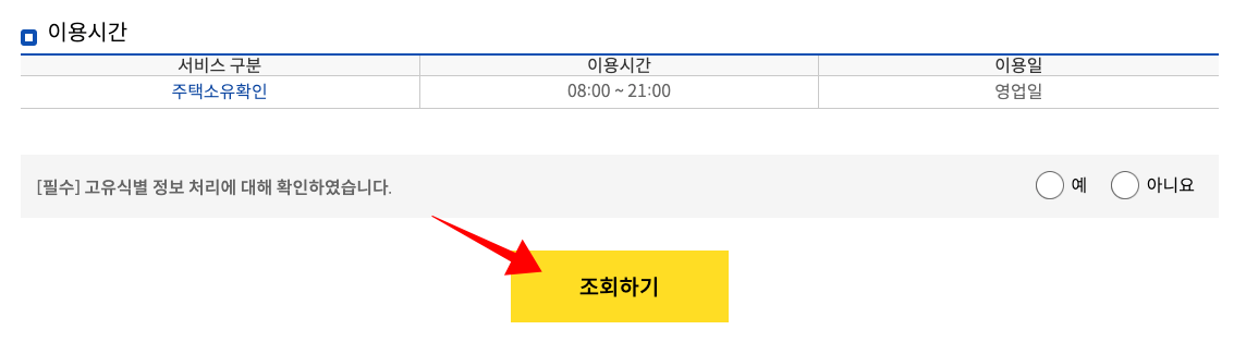 주택소유확인이 가능한 이용시간은 08:00 ~ 21:00까지 입니다. 조회하기 버튼을 눌러서 계속 진행해주시면 되겠습니다.