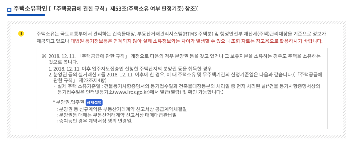 주택소유 확인 관련 내용입니다. 조회되는 내용은 국토교통부에서 관리하고 있는 건축물대장과 부동산거래관리 시스템, 재산세 관리대장을 기준으로 정보가 제공되고 있습니다. 실제 대법원 등기정보와는 실시간 연계가 되지 않는 조회자료입니다.
