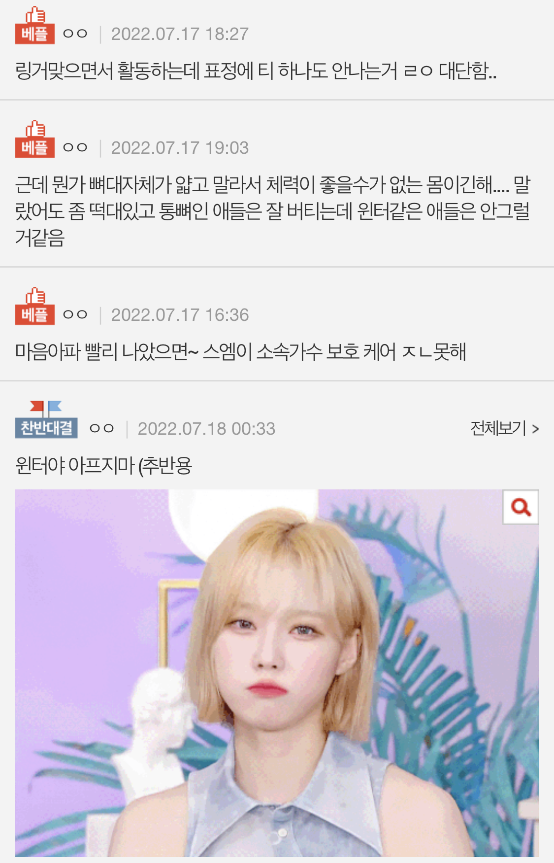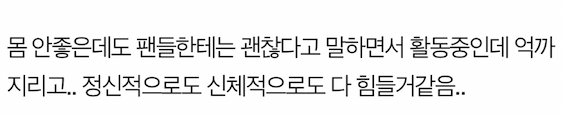 결국 윈터가 직접 버블로 "정말 괜찮은 줄 알았는데, 몸이 아직 좋지 않다. 실망시켜서 정말 미안하다. 푹 쉬고 낫도록 하겠다. 정말 미안하고 보고 싶다고" 사과했습니다. ㅠㅠ